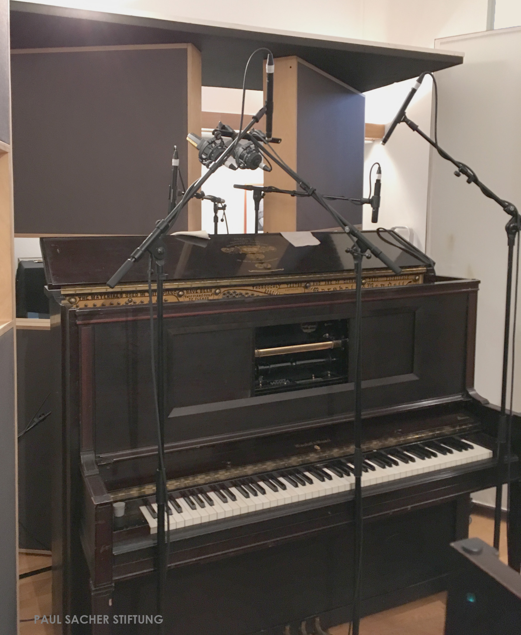 One of the purposes of the present project was to carry out the first scientific acoustic documentation of Nancarrow’s original instruments. Following extensive planning and several tests, the documentation was carried out by Cedric Spindler and Helena Bugallo at the Paul Sacher Foundation in the early months of 2018. The room where the instruments are currently placed was outfitted with acoustic panels for the multichannel recording [Ex. 5].